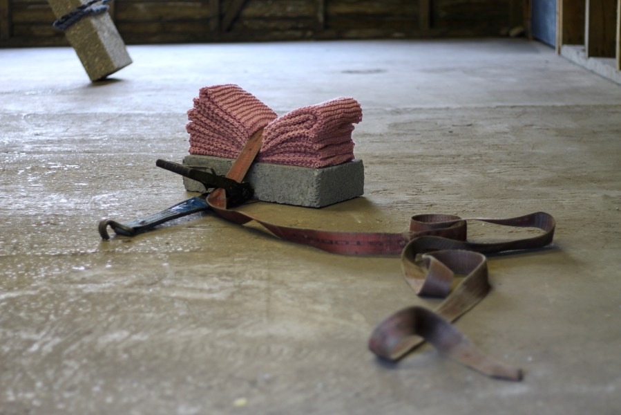 Untitled, 2019 – Concrete block, knitted yarn, ratchet strap.